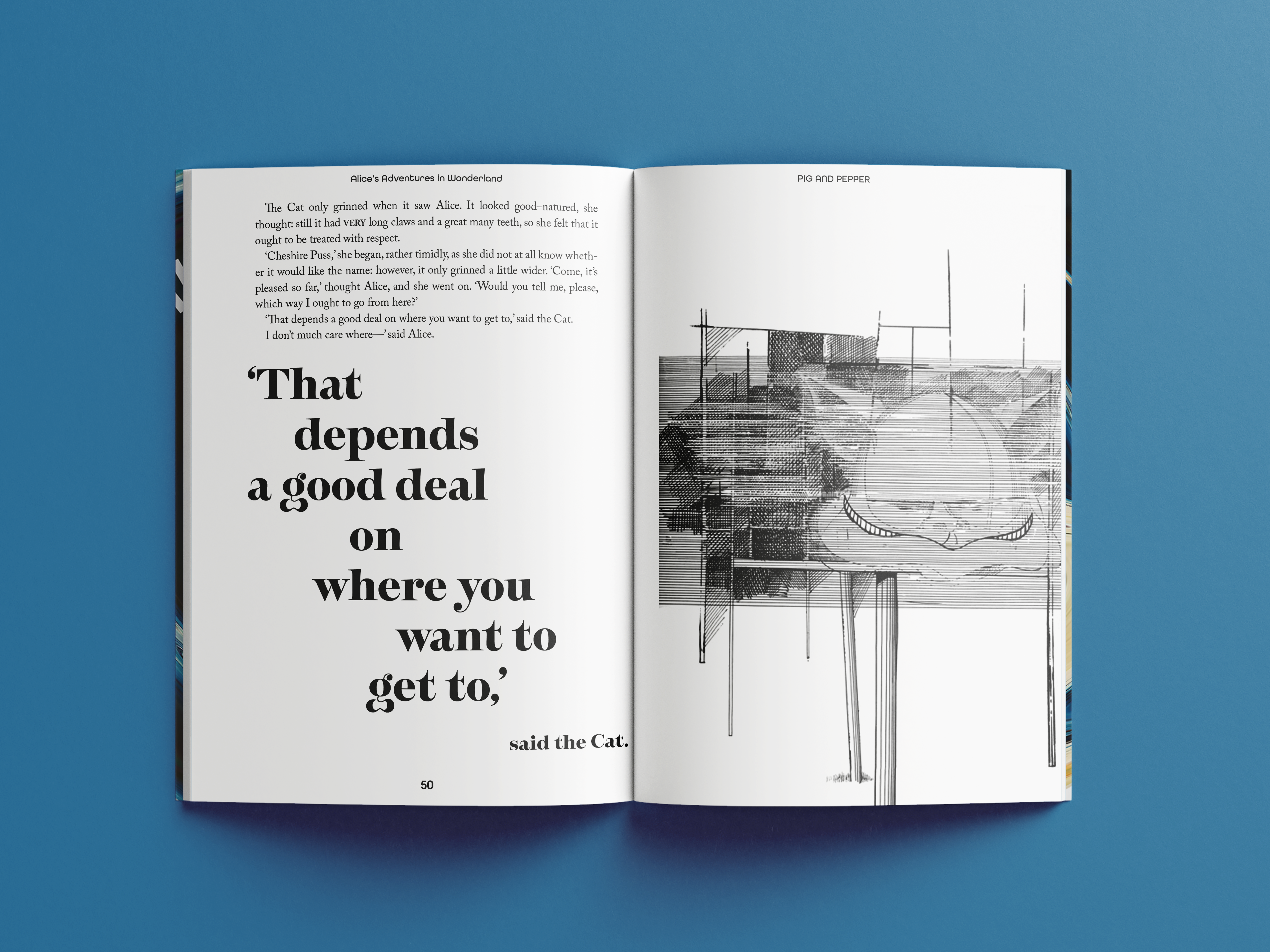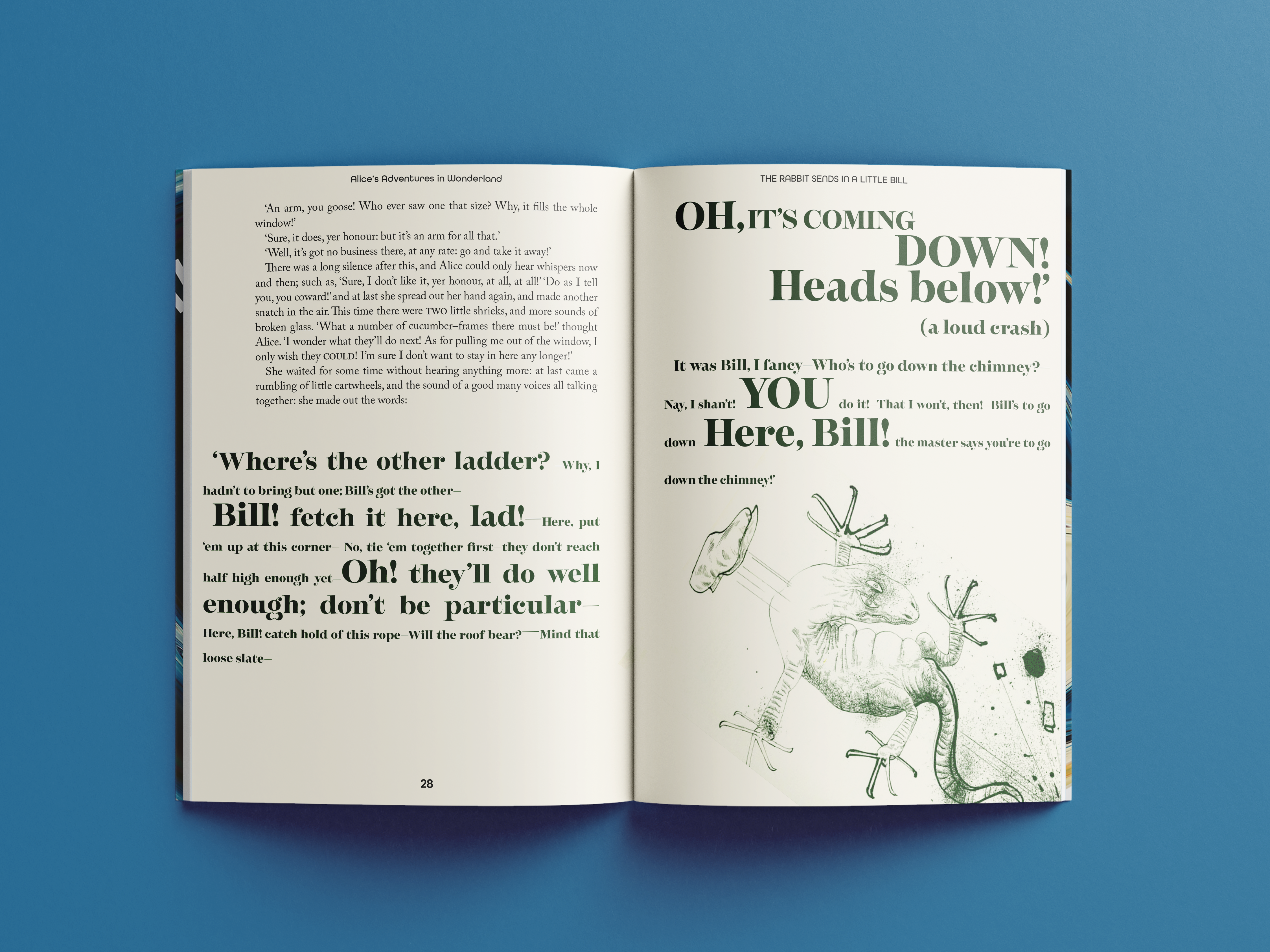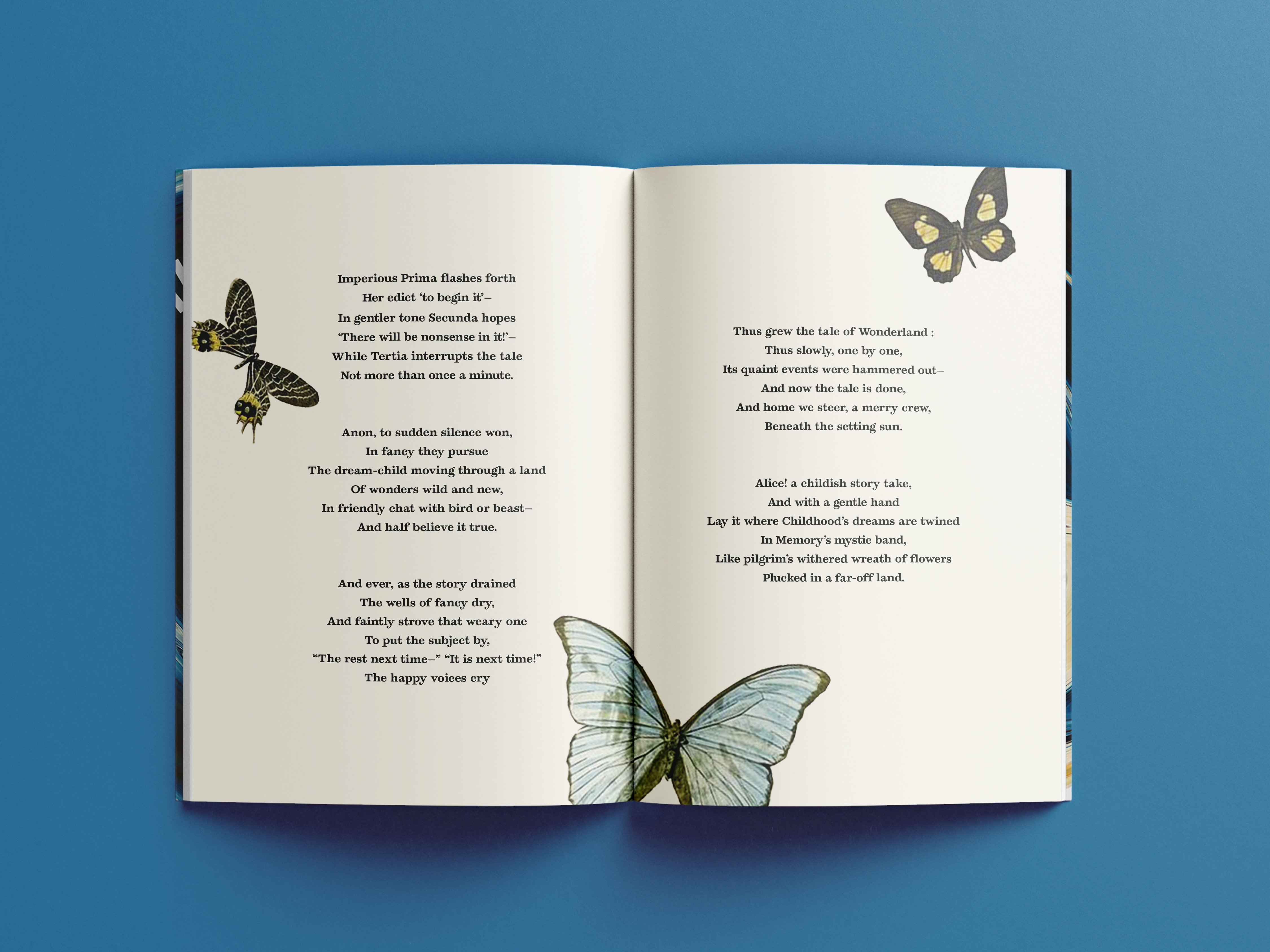 This is a book design assignment for my typography class, in that studio we were asked to design a book with text and images. I chose Alice's adventure in wonderland because it is one of my favorite books. When I did my research, I found some very interesting images drawn by famous artists for this book. Here I chose illustrations by Salvador Dali and Ralph Steadman. I chose Dali's art because his paintings give people an eccentric, dreamlike feeling, which from my