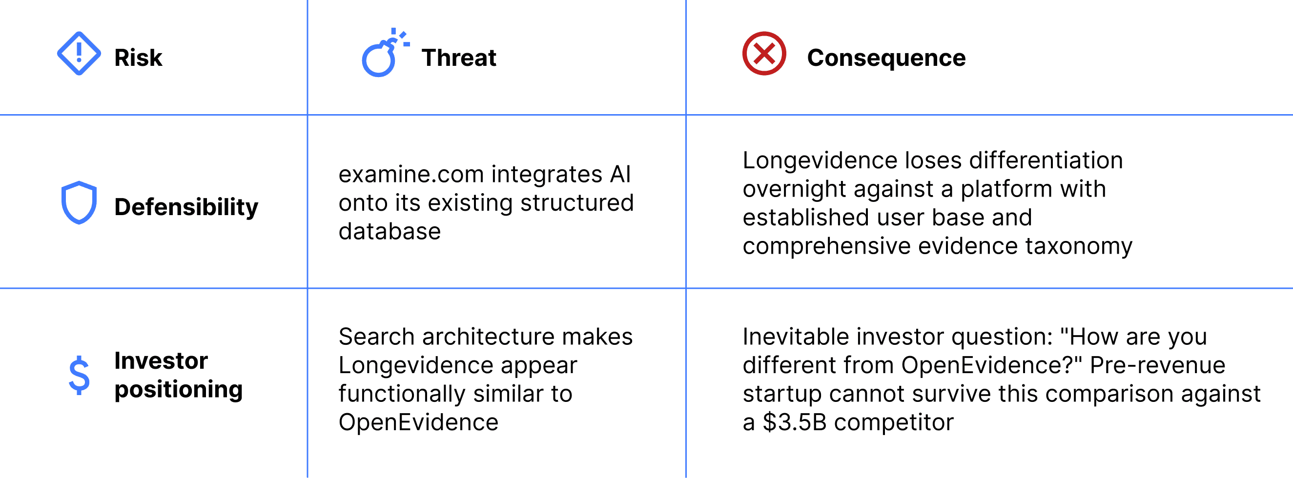 This positioning allows Longevidence to grow without triggering competitive response from a resource-dominant player — the ideal strategic condition for an early-stage startup.