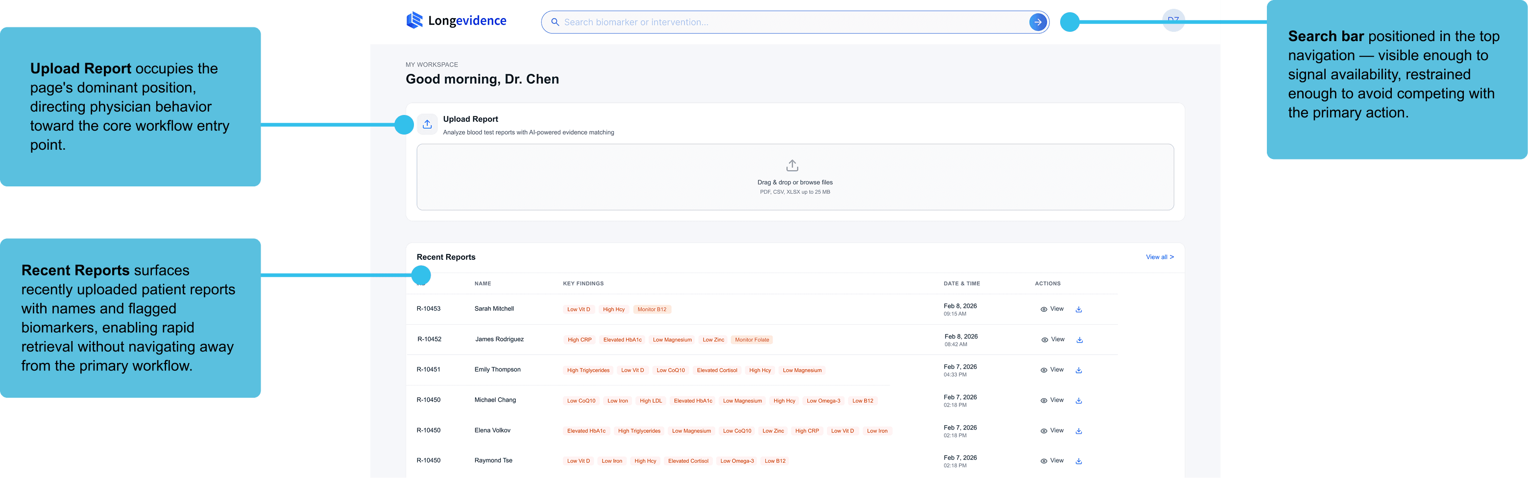 This analysis produced a placement framework I applied to Longevidence: upload occupies the primary action zone, search is positioned in the secondary zone — accessible but subordinate to the core workflow.