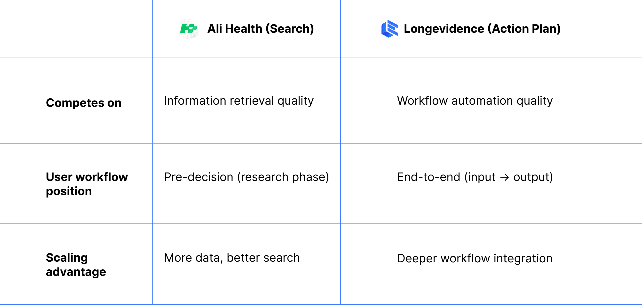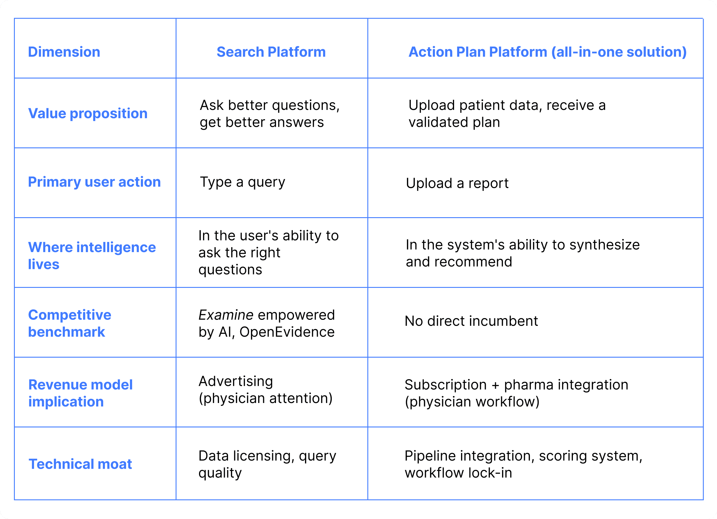 Both product forms share the same core functions — search, report upload, evidence display, action plan generation. The question is which function leads. Different emphasis produces different product positioning, different competitive dynamics, and different investor narratives. A search-led product enters OpenEvidence's category. An upload-led product defines a new one.