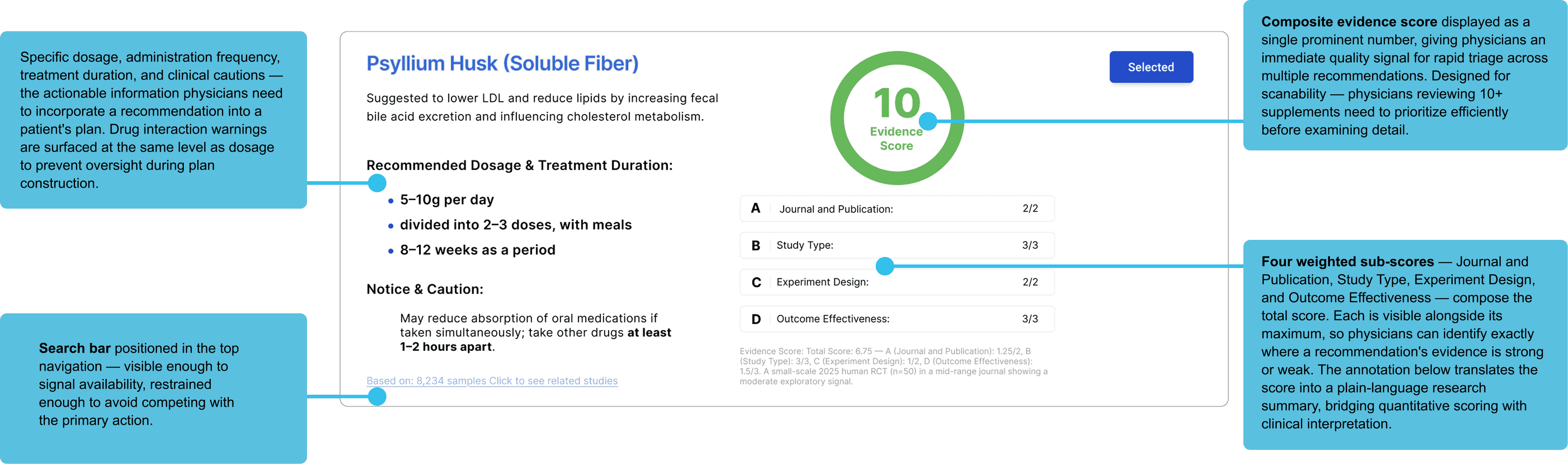 I designed a multi-layered evidence display for each recommendation: composite evidence score with four weighted sub-scores independently inspectable, specific dosage and treatment duration, clinical risk considerations, drug interaction alerts, and a full reference panel linking to primary studies with authors, journals, sample sizes, and trial outcomes. The physician can trace any recommendation from aggregate score → scoring methodology → individual study — a complete auditability chain from conclusion to source.