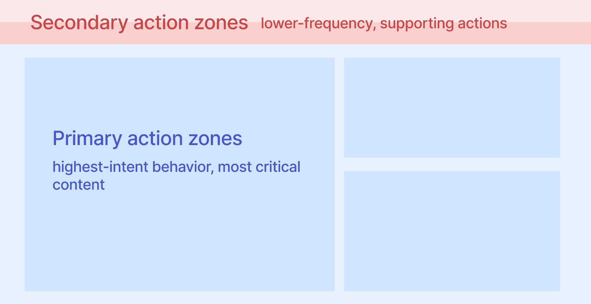 I used functional hierarchy analysis method, deconstructed both into primary action zones (highest-intent behavior, most critical content) and secondary action zones (lower-frequency, supporting actions).