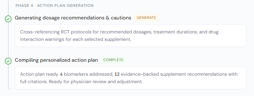 I designed a scrolling step-by-step analysis sequence that makes each stage of the agent's pipeline visible as it executes: which biomarkers were identified from the report, which databases were queried, how many studies were retrieved per biomarker, and how participants and trial data were aggregated.