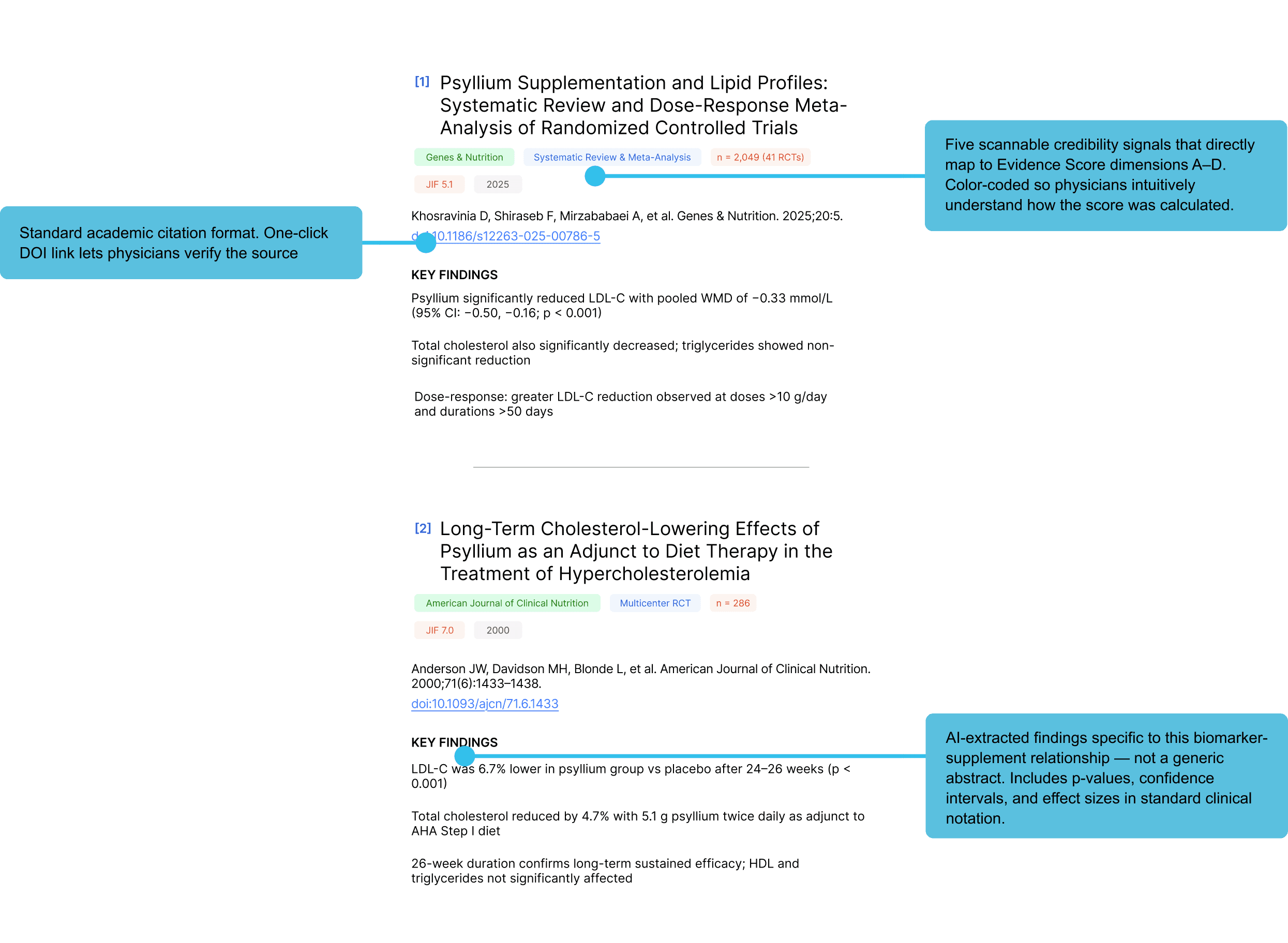 The evidence display is structured as a drill-down path from conclusion to source. The recommendation card above gives physicians the composite score, sub-score breakdown, dosage, and cautions — sufficient for rapid triage. When a physician needs to verify the basis of a score, the reference panel below surfaces the underlying studies with findings extracted specifically for this biomarker-supplement relationship.