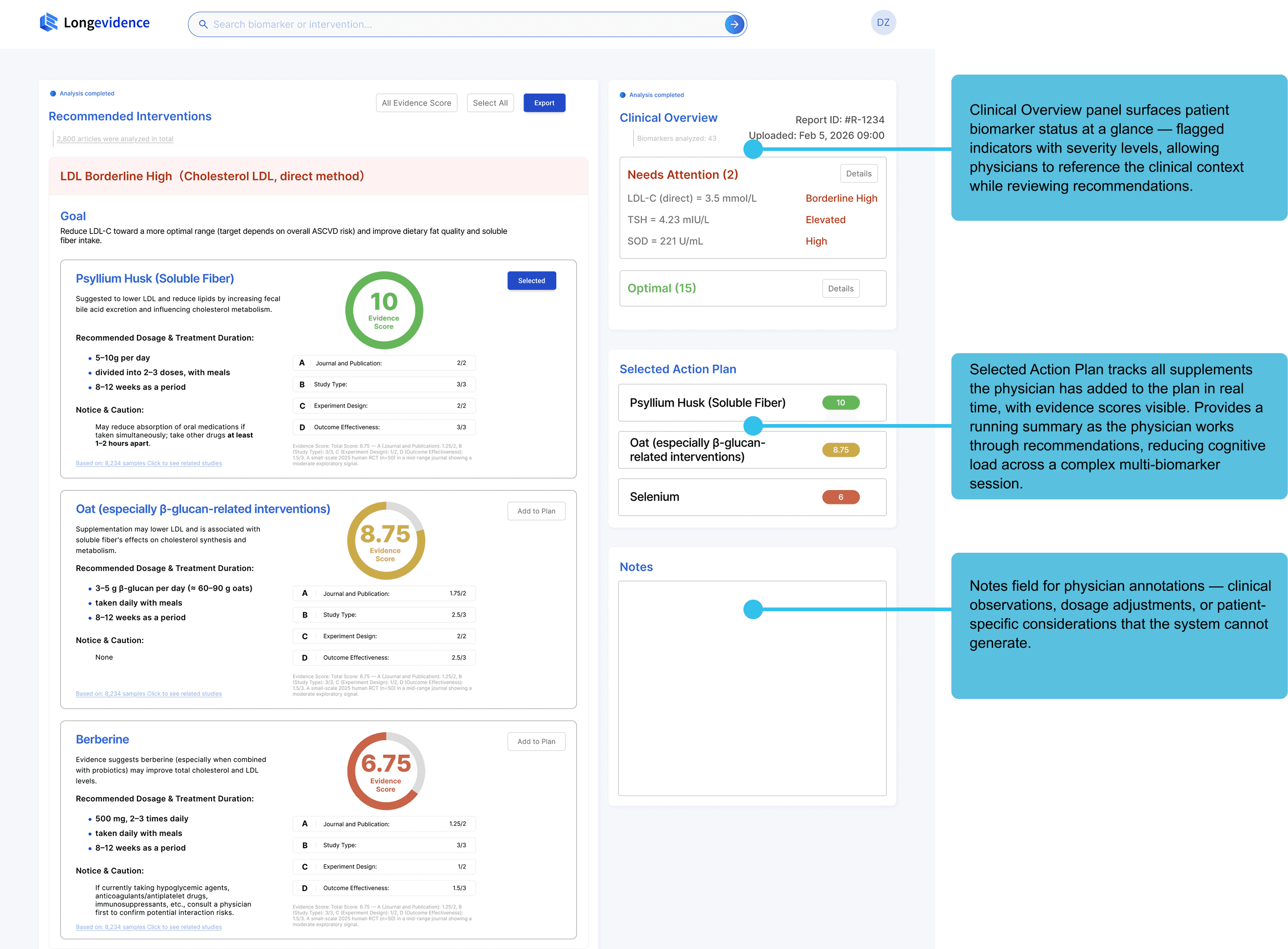 Physicians interact with multiple recommendations across multiple biomarkers in a single session. The interface must support efficient review, selection, and documentation without disrupting clinical decision-making flow.