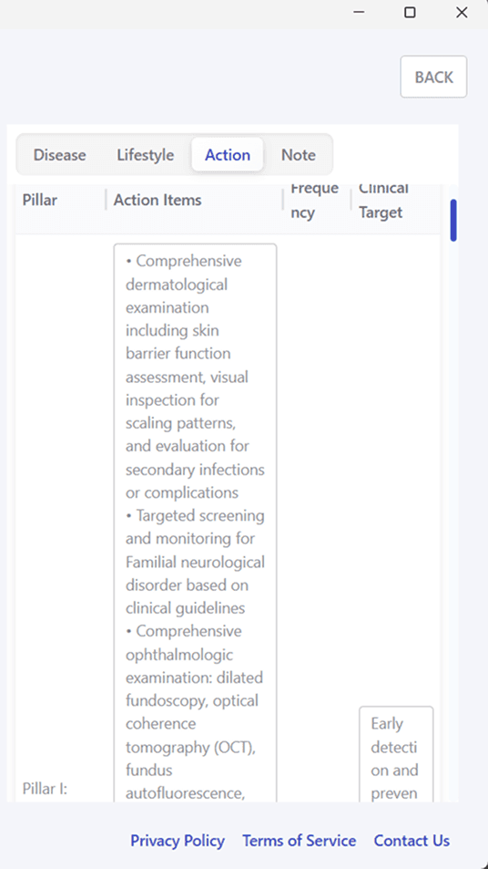 Physicians can create editable action plans based on the patient's current situation. A patient with a genetic skin condition who currently has a broken leg needs different immediate guidance than the AI's default recommendation. The action plan button gives physicians space for clinical judgment that goes beyond — or overrides — AI suggestions.