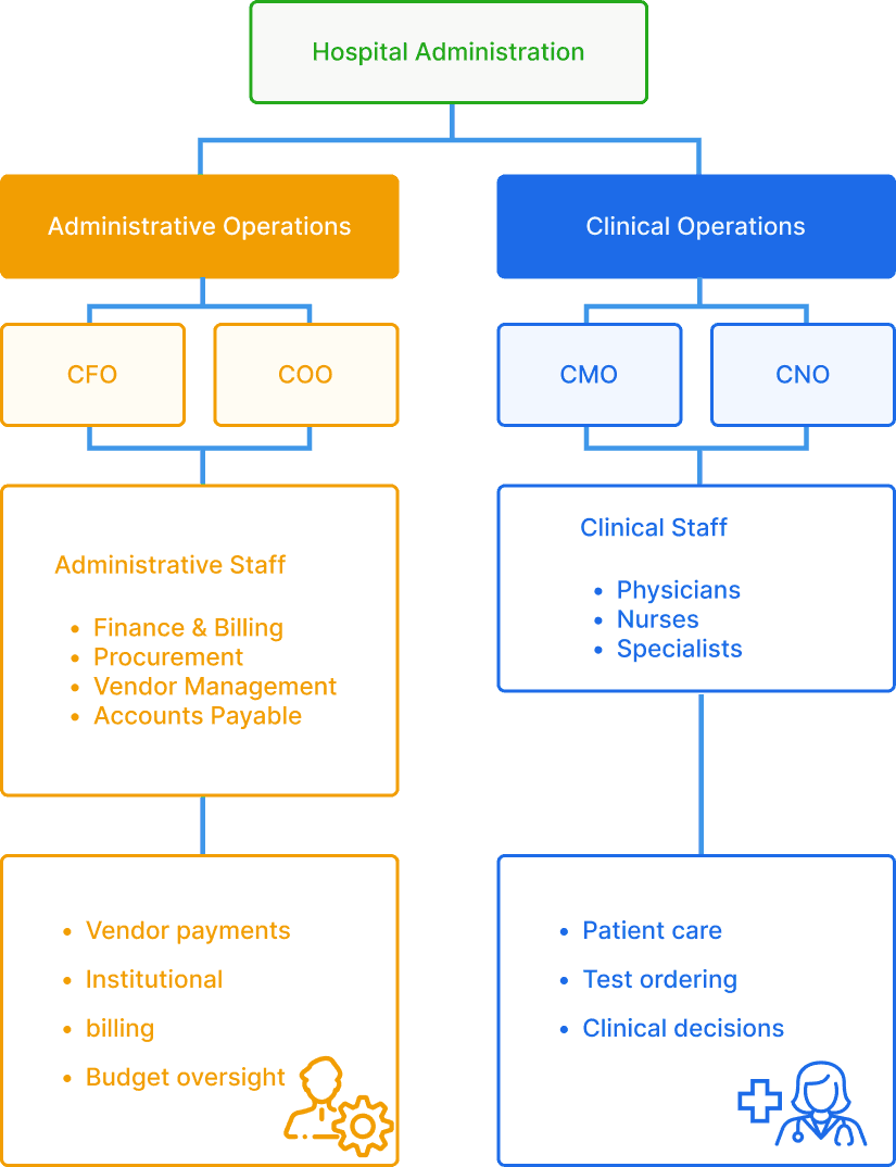 A consistent structural pattern emerged across every institution studied. Large hospitals maintain dedicated departments for finance, billing, and procurement — entirely separate from clinical operations. Physicians operate exclusively within the clinical domain.
