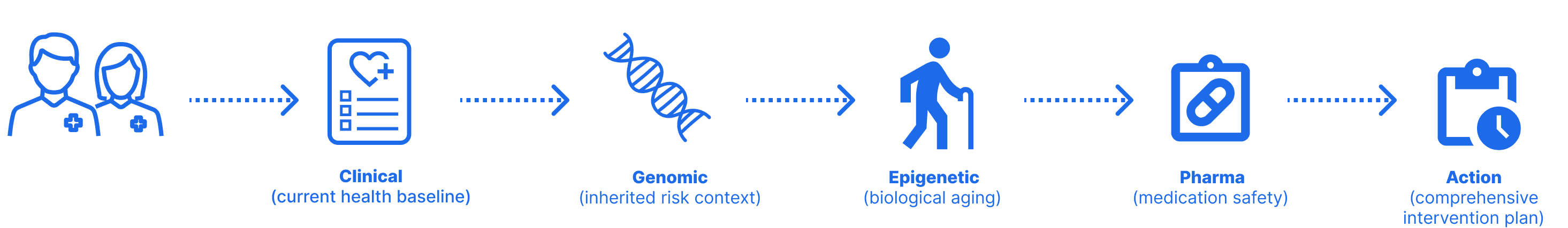 Gen-Decoder and Epi-Insight provide diagnostic analysis — identifying genetic risks and biological aging status. Longevity medicine, however, requires prescriptive guidance: which risks demand immediate intervention, what specific actions optimize an individual's healthspan, and how should interventions be prioritized and monitored.