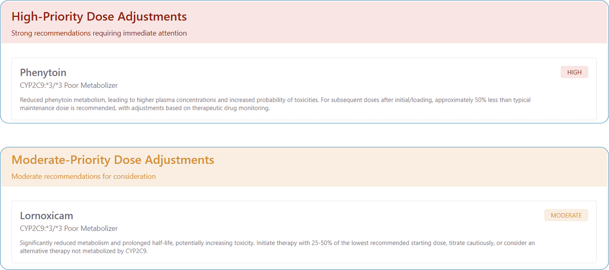 Two-tier prioritization. High-priority items (immediate dose adjustments) visually separated from moderate-priority items (consider during relevant prescribing). Prevents alert fatigue while ensuring nothing safety-critical is missed.