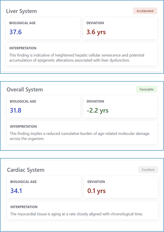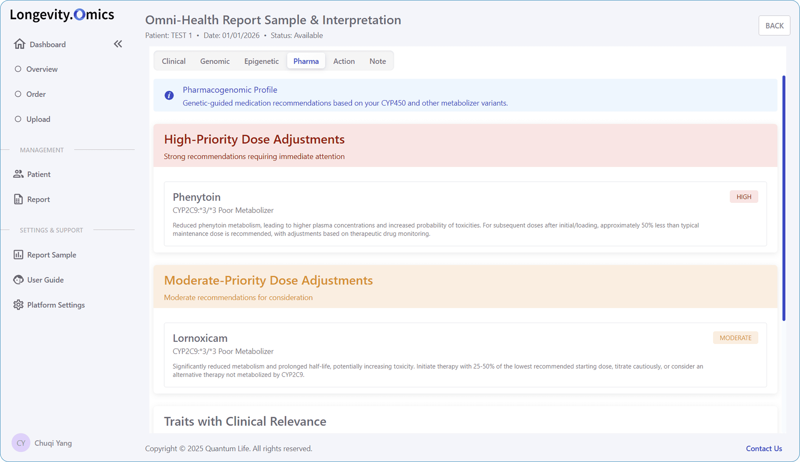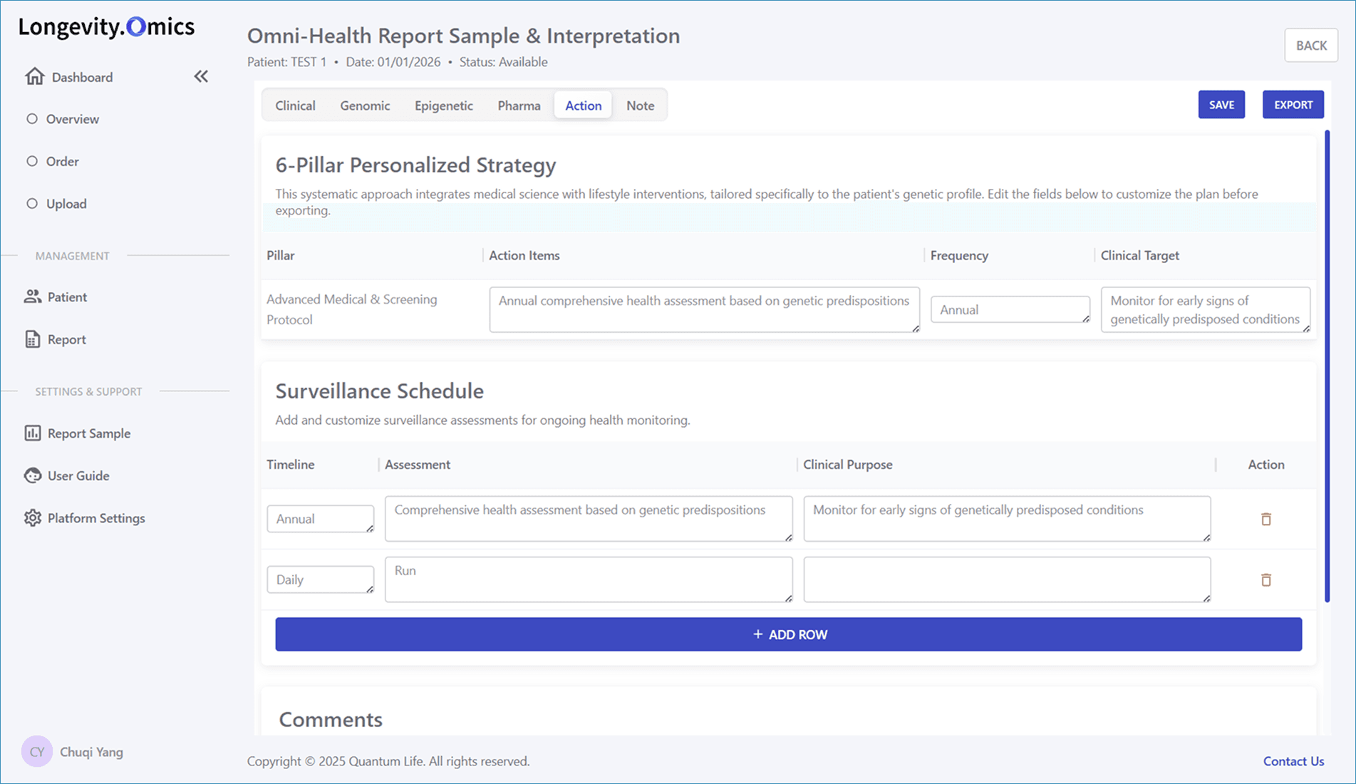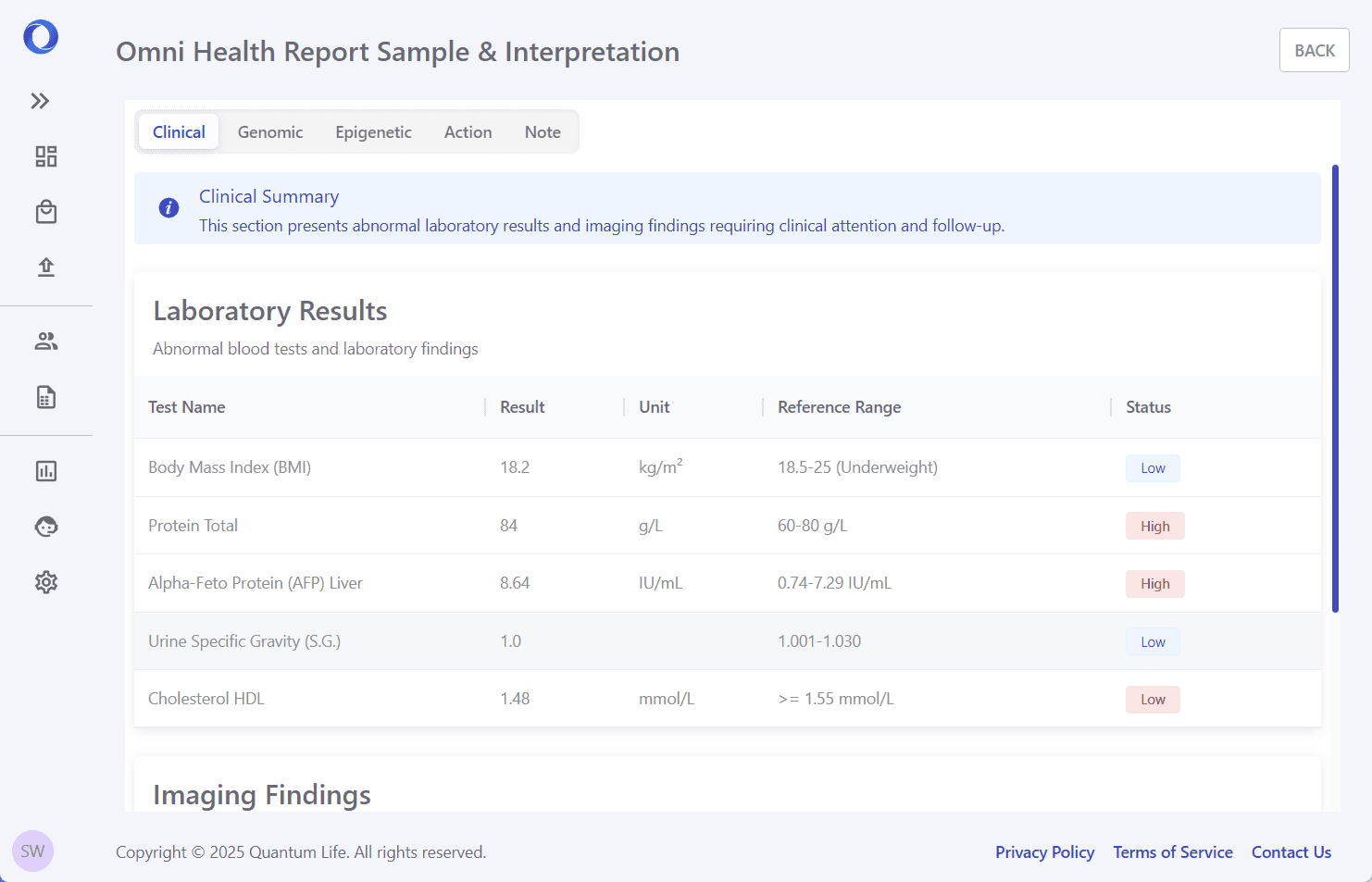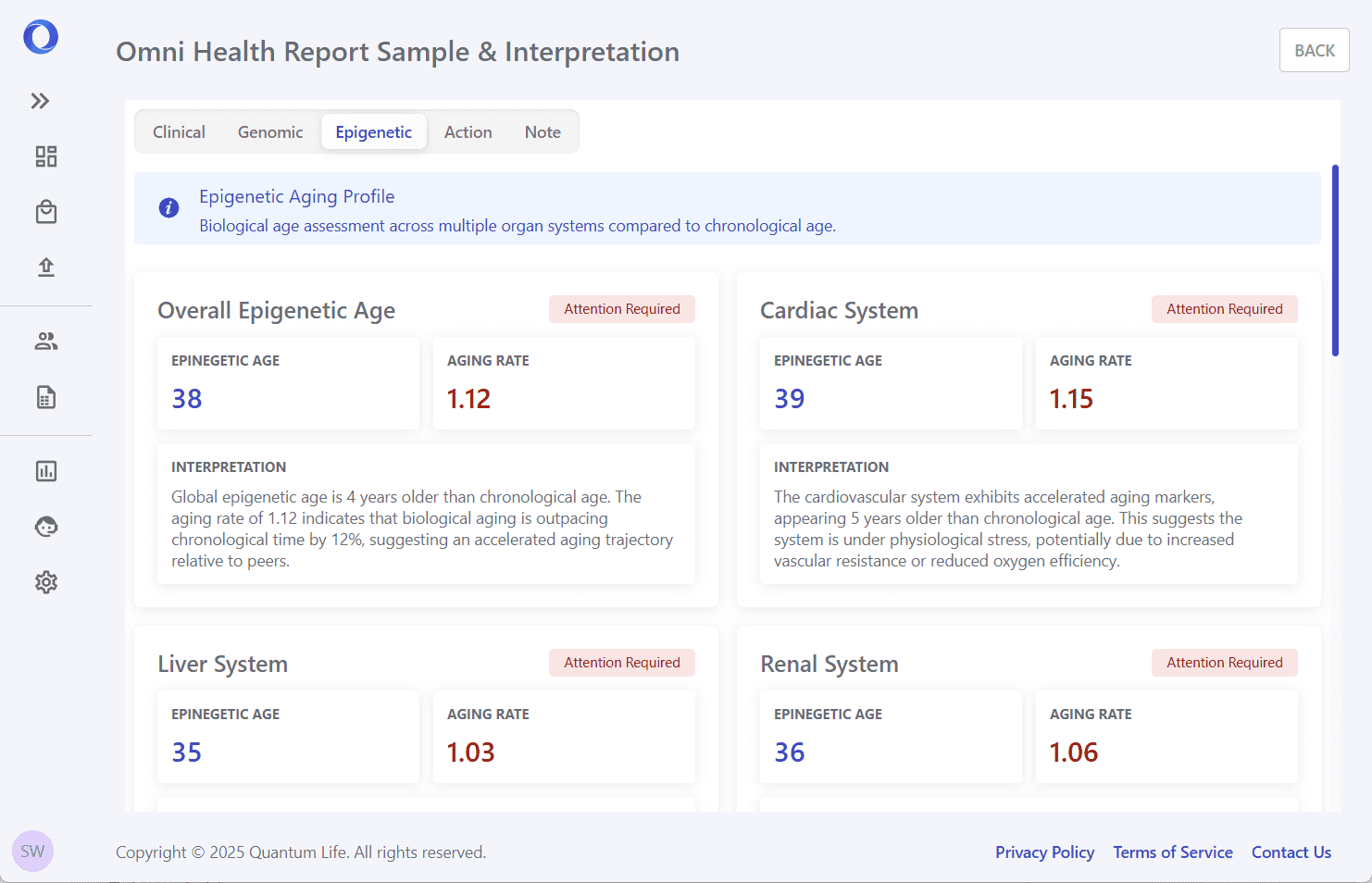 Omni-Health synthesizes all patient data — lab results, Gen-Decoder findings, Epi-Insight aging assessments — into a comprehensive clinical action strategy. Its design innovation operates at the information architecture level rather than the interface level. The strategic challenge was organizing multi-dimensional data into a coherent clinical decision workflow.