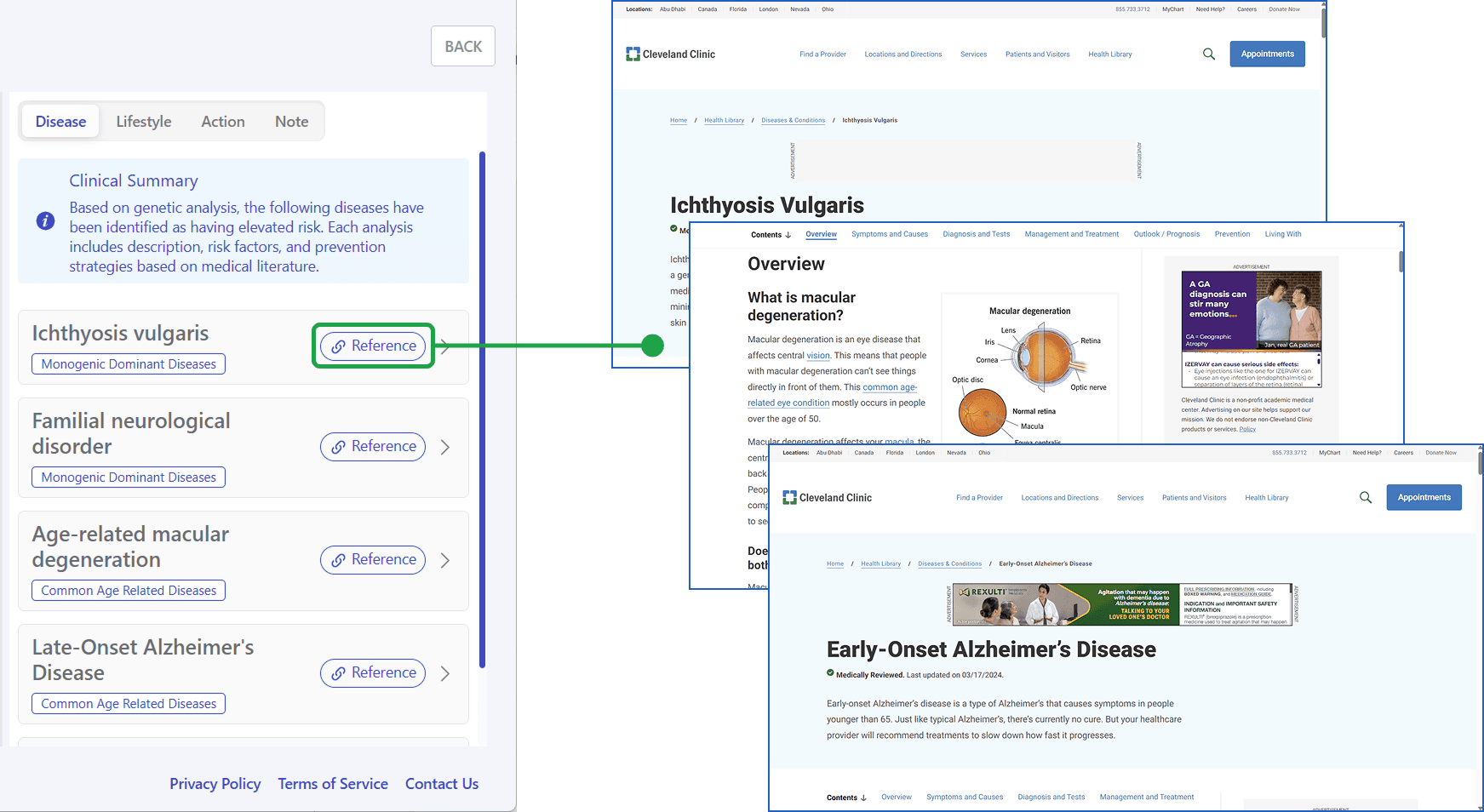 The right panel distills complex genetic findings into scannable clinical summaries. Each condition surfaces a brief clinical description, risk factors, and disease classification — eliminating raw variant codes from the physician workflow. Physicians assess the clinical picture without interpreting sequencing notation, completing review within consultation time constraints. The interface needed to outperform the alternative workflow, not merely improve upon it.
