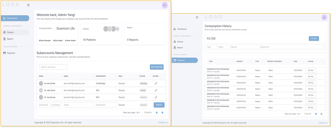 Beyond the core clinical interface, the complete operational infrastructure required design: patient management, service ordering, and report management for the Doctor Portal; dashboard, sub-account management, and payment tracking for the Admin Portal.