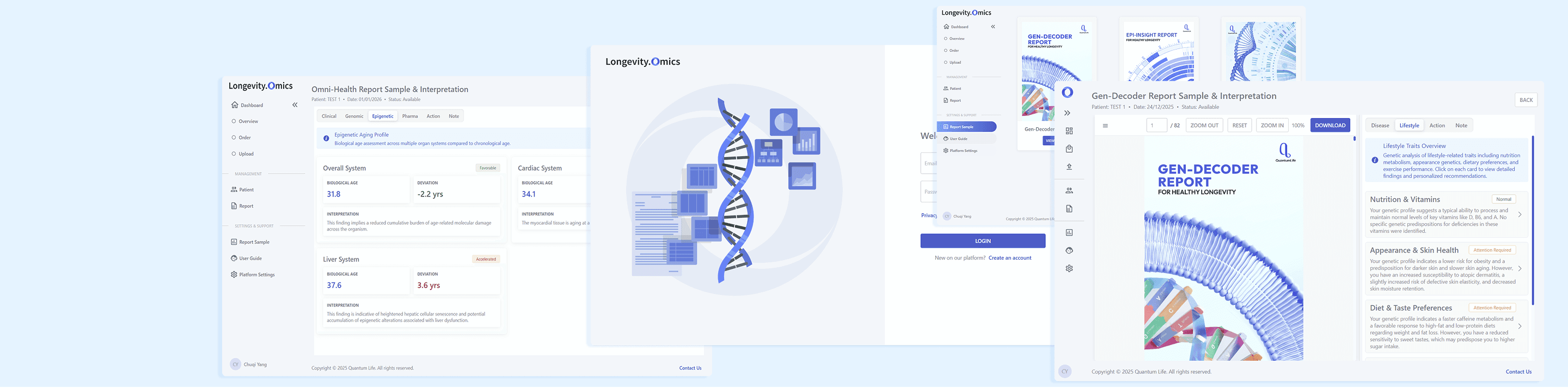 I led product strategy and end-to-end interface design as the designer on the project. For Longevity.Omics, I independently drove: