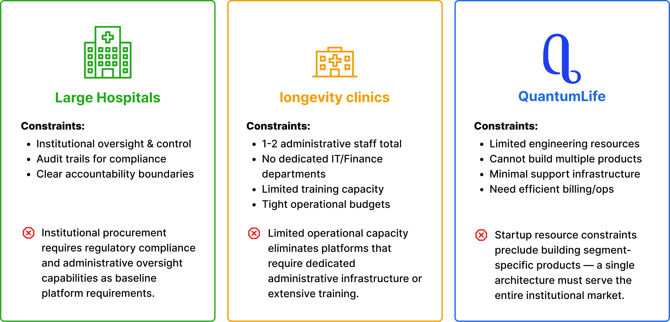 Large hospitals receive institutional compliance through the admin portal. Boutique clinics operate with a simplified administrative layer. The clinical interface remains identical across deployments. This eliminated the need for segment-specific products — avoiding what would have been a resource-prohibitive development path for an early-stage company.