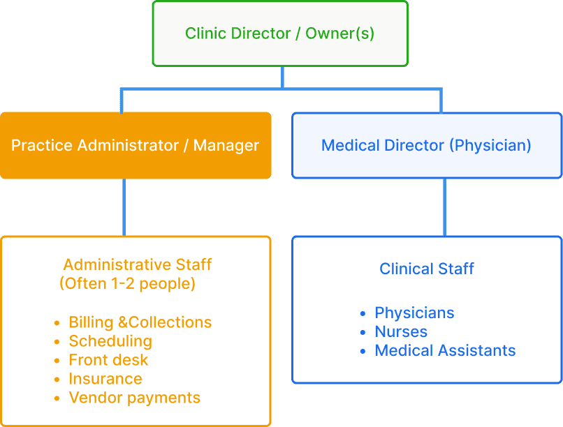 Despite different scales and role complexity, the separation between administrative operations and clinical work is universal — and it's not organizational preference.